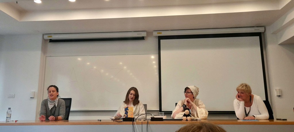 It Takes a Village: Rural Superstition and Sacrifice in Folk Horror (panel discussion) Worldcon in Glasgow 2024, from left to right: Premee Mohamed, Ruthann Jagge, Nadia El-Fassi, Antonija Mežnarić, E. Saxey
